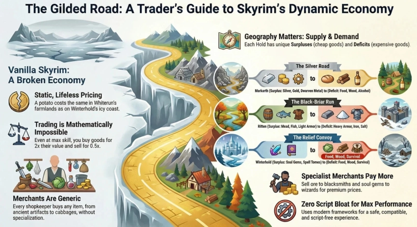 Модификация за авторством Vuszu добавляет зависимость стоимости товаров от региона купли-продажи. Например, в Вайтране дешевые продукты, а в Маркарте — слитки и руда. Логично, что жители Винтерхолда готовы платить за еду, а маги с удовольствием скупят все камни душ. За не самую честную добычу можно получить честную плату у каравана каджитов.