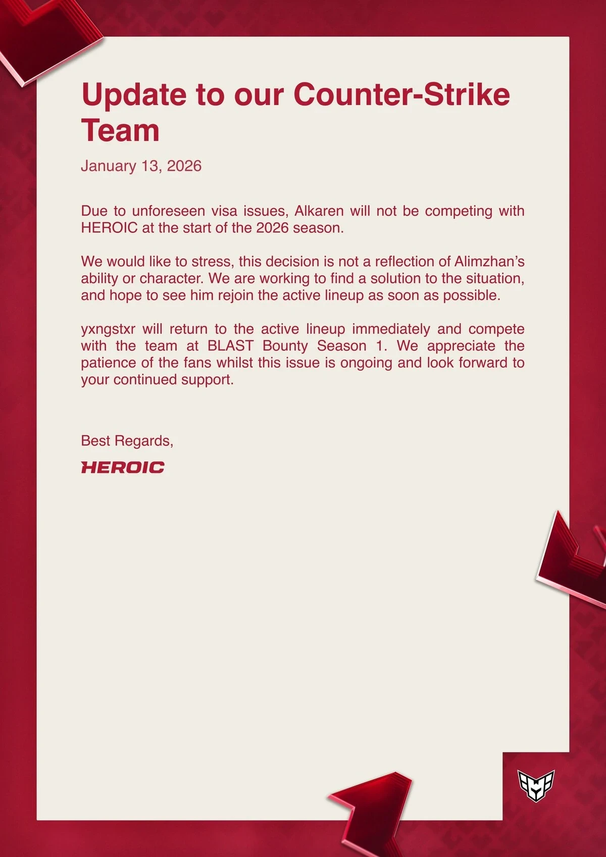 Источник: HLTVНорвежская организация HEROICпо Counter-Strike 2 столкнулась с форс-мажором накануне старта соревновательного сезона 2026 года. Команда официально объявила, что Алимжан «Alkaren» Битимбай не сможет помочь коллективу на ближайших турнирах из-за бюрократических сложностей.