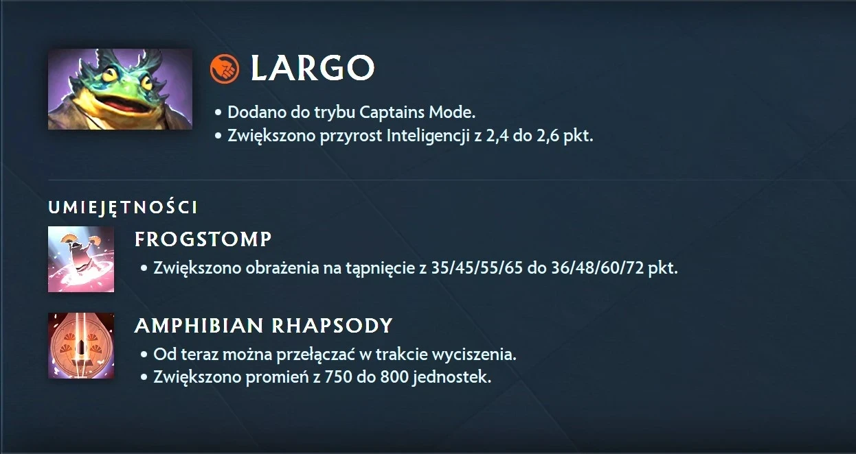 Largo был добавлен в режим Captain’s Mode и получил усиление интеллекта увеличен с 2,4 до 2,6, урон увеличен с 35/45/55/65 до 36/48/60/72, радиус Amphibian Rhapsody увеличен с 750 до 800, а также способность теперь можно переключать под действием безмолвия. Помимо этого, чемпиона теперь можно будет увидеть на про-сцене.