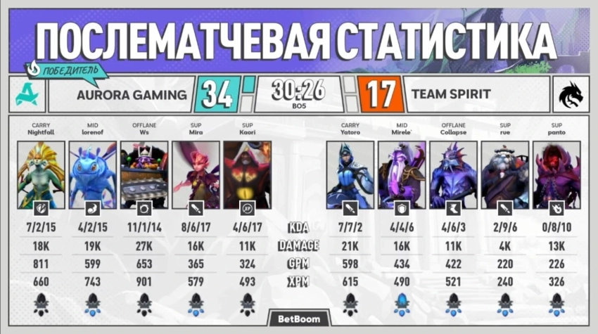 Решающая битва турнира FISSURE Universe: Episode 8 обернулась настоящей катастрофой для Team Spirit. На пятой карте Aurora Gaming продемонстрировала безупречную игру, уничтожив соперника со счетом 30:4 всего за 32 минуты.