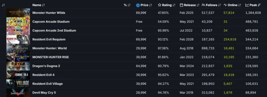 Онлайн игр Capcom в Steam. Источник: SteamDB