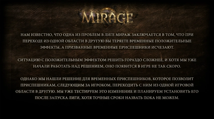 Обложка: официальный арт игры Path of ExileGrinding Gear Games предупредила игроков Path of Exile о проблеме в лиге испытаний Мираж. Она заключается в следующем: при переходе между областями персонаж теряет временные положительные эффекты, а призванные временные приспешники исчезают.