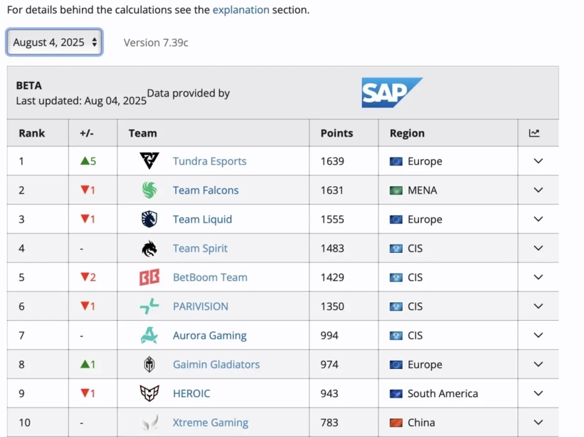 — В августовском обновлении вершину списка занимала Tundra Esports.